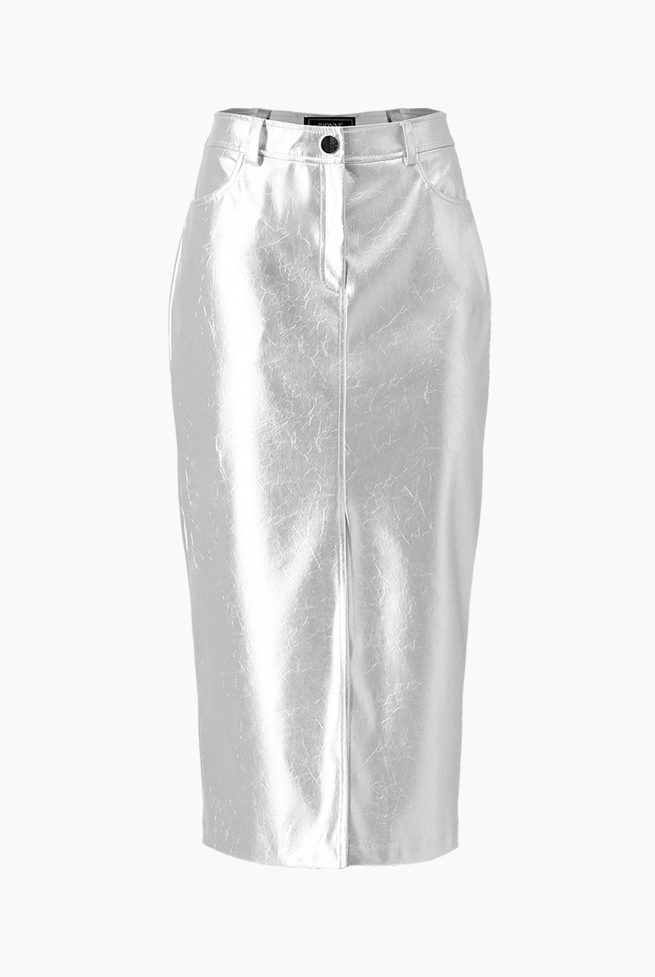 Falda larga recta en color plata con abertura frontal, bolsillos y presillas. Silueta entallada que resalta tu figura.