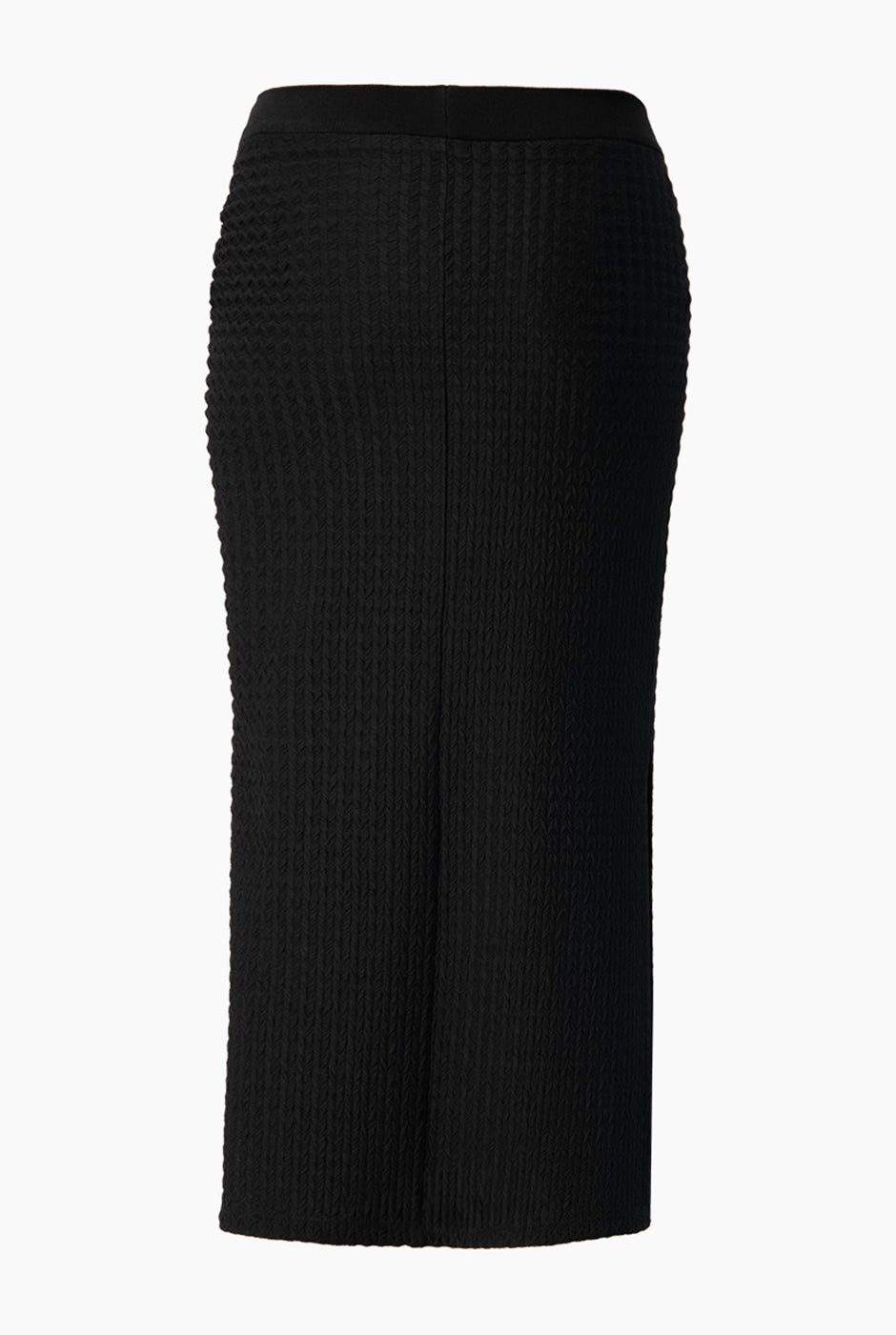Falda midi negra tejida, con aberturas laterales. Silueta entallada para un look casual moderno.